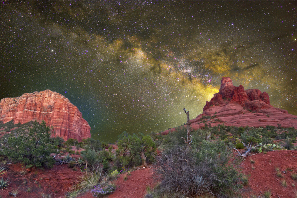 #5- Courthouse Butte, Sedona, AZ- May, 2025. I arrived here around 5:30 pm. People were still hiking through the area and taking pictures. I wanted to find a location with some items of interest in the near, middle ground, and distance. There were a few colorful flowers, cacti, and the remnants of a tree and of course the butte in the middle ground. Being a new moon, the Milky Way was dramatic. I took a nice “blue hour” photo to capture the plants and landscape and remained until after 1:30 to get the Milky Way. Sedona is a beautiful place but during the day, the temperature was over 105 degrees so scouting locations meant drinking a lot of water.